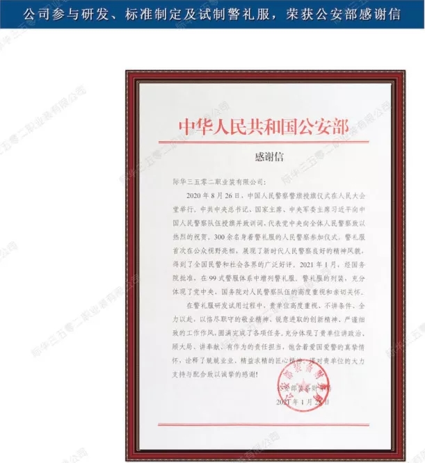 际华3502公司独家试制独家生产警礼服获肯定,公安部发来感谢信