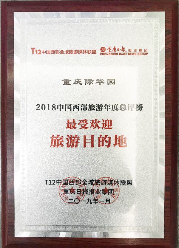 1月16日,由中国西部地区12省区市主流媒体集团共同主办的“第二届T12中国西部全域旅游发展论坛”上,历时两个月、近600家全域旅游发展相关单位参与角逐、超2000万网友参与评比打分的“2018中国西部旅游年度总评榜”揭晓,重庆际华园荣获“最受欢迎旅游目的地”荣誉。