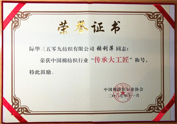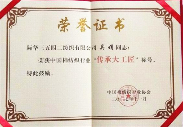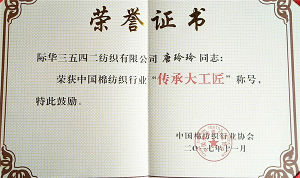 11月27日,在上海召开的中国棉纺织行业“传承大工匠”表彰大会上,际华3542公司员工唐玲玲、吴娟,际华3509公司员工张利萍荣获中国棉纺织行业“传承大工匠”荣誉称号。