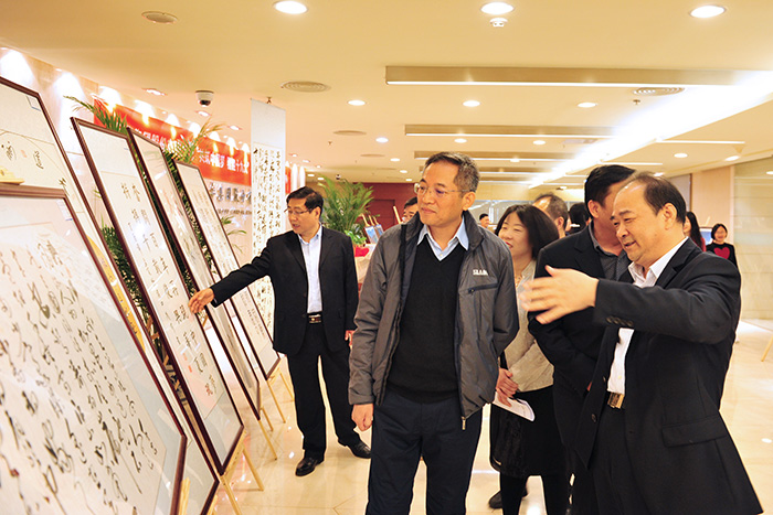 在举国欢庆、喜迎党的十九大胜利召开之际,为展现际华集团广大职工的精神风貌和文化建设成就,团结和引导际华集团广大干部职工以更加饱满的精神,更加昂扬的斗志,更加优异的成绩迎接党的十九大胜利召开,际华集团 “共筑中国梦  喜迎十九大”书画、绘画、篆刻作品巡回展在京开幕并巡展。10月16日上午在公司总部机关举行了开幕式揭牌仪式,际华集团董事长、党委副书记李学成、总经理韩文虎为本次巡展揭牌,党委副书记、纪委书记王兴智致辞,工会主席刘海权宣读表彰决定。