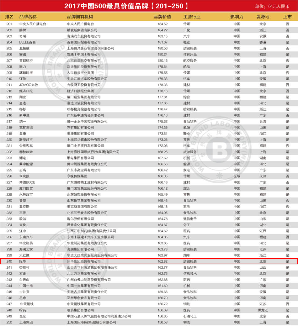 日前,权威品牌研究评估机构世界品牌实验室(World Brand Lab)在北京举行的2017年度“世界品牌大会”上发布了2017年《中国500最具价值品牌》分析报告。根据世界品牌实验室的最新评估结果,际华集团以“际华”品牌连续两年入选“中国500最具价值品牌” 榜单,排名第240名,品牌评估价值达到162.82亿元。