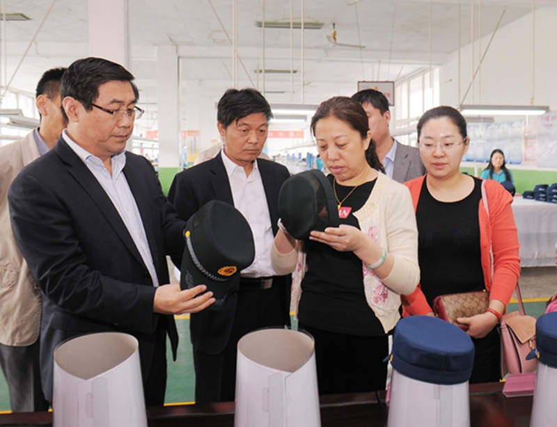 中央军委后勤保障部军需能源局被装处处长侯晓明、际华集团总经理韩文虎一行对际华3506公司夏常服帽生产情况进行检查