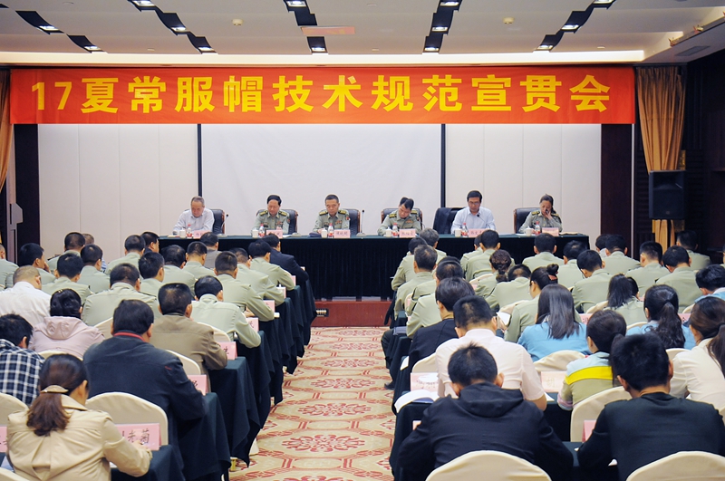 中央军委后勤保障部军需能源局被装处处长侯晓明、军需军事代表局局长张绍清、军需装备研究所所长黄汉斌等军队领导和夏常服帽生产企业领导出席在际华3534公司举行的技术规范宣贯会