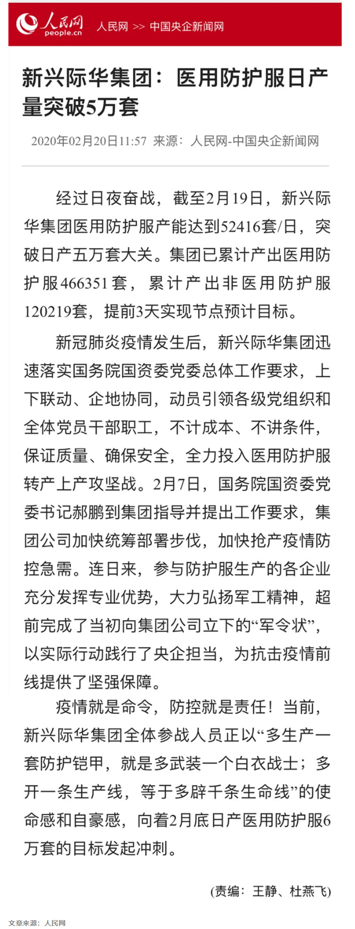 《人民网》《新浪财经》新兴际华集团医用防护服日产量突破5万套