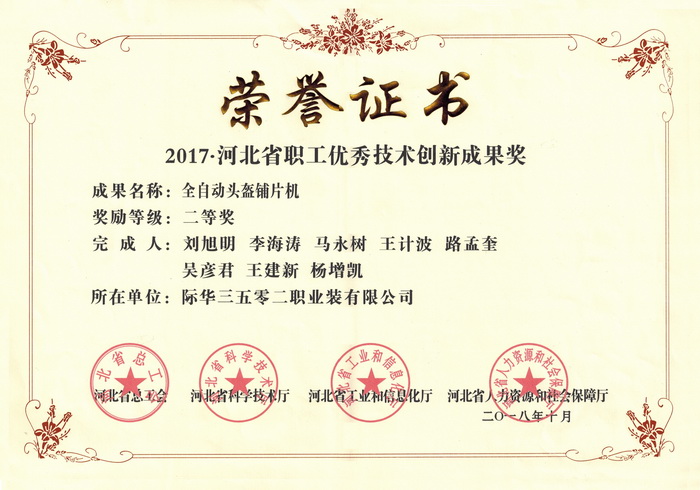 际华3502公司获河北省职工优秀技术创新成果二等奖