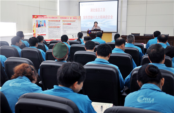 11月4日,湖北省总工会宣贯十九大精神活动走进际华三五四二纺织有限公司。公司党委书记、工会主席鲁志勇,总经理张慧霞等领导与100余名党员干部一起,聆听在先、学习在先,深刻领会十九大精神。