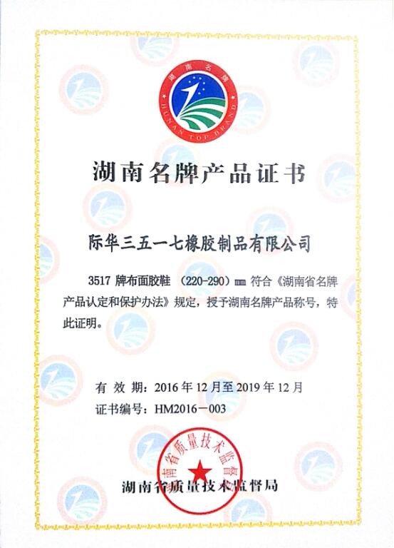 近日,在湖南省质量技术监督局发布的湖南名牌产品公告中,际华3517公司生产的“3517牌布面胶鞋”榜上有名,这是该公司转型升级、战略转移取得的又一喜人成果。