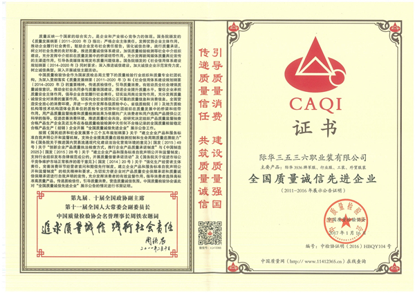 50年来,际华3536公司生产的服装,有50余个品种获军优、部优称号。研发的“际华3536牌服装”自2014年起连续获得四川省政府“四川名牌产品”称号,2015年被认定为“四川省著名商标”,是四川省“守信用重合同企业”、全国“产品质量保障诚信经营示范单位”。此次获得“全国质量诚信先进企业”等荣誉,再次表明公司在质量管控上的六大方法科学有效。