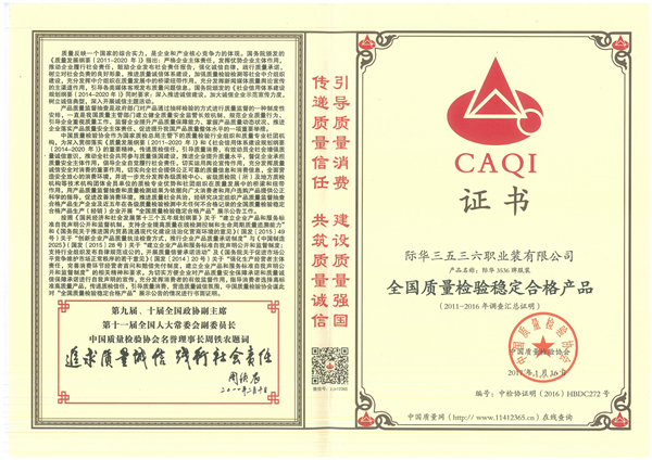 1月16日,中国质量检验协会向际华3536公司颁发两个荣誉证书,分别是“全国质量诚信先进企业”和“全国质量检验稳定合格产品”证书。两项荣誉的获得,源于公司在质量管控上坚持采用的六个方法。