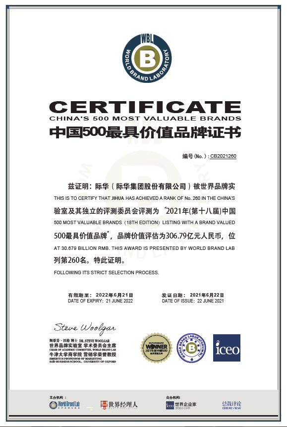 2021年6月22日,由世界品牌实验室(World Brand Lab)主办的第十八届“世界品牌大会”暨2021年中国500最具价值品牌发布会在北京成功举行。新兴际华集团旗下际华股份凭借市场表现和品牌积淀,以306.79亿元的品牌价值评估重返榜单,位列第260位。这是际华品牌价值首次突破300亿元,比2017年的162.82亿元增幅88%,彰显了际华品牌迈入新时代蓬勃向上的发展姿态。