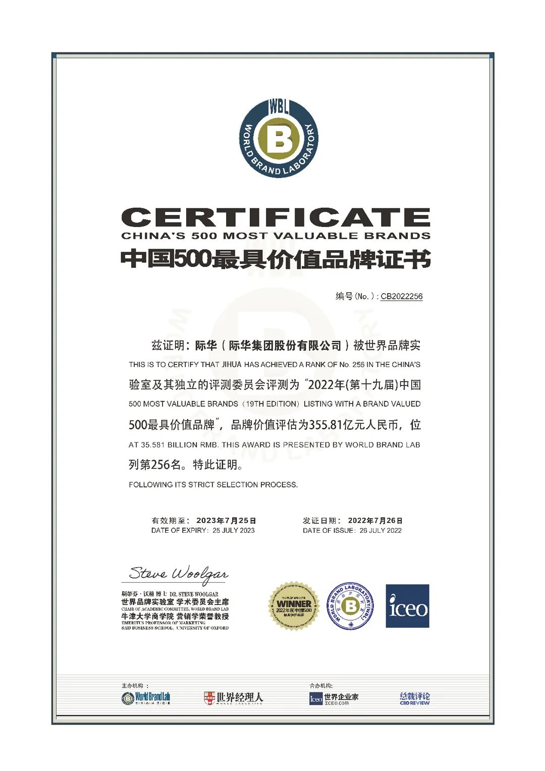 由世界品牌实验室(World Brand Lab)主办的第十九届“世界品牌大会”于7月26日在北京举办,会上发布了2022年《中国500最具价值品牌》分析报告。基于财务数据、品牌强度、客户行为分析的评估模型,“际华”品牌价值再提升,达到355.81亿元,提升近50亿元,位列256名。