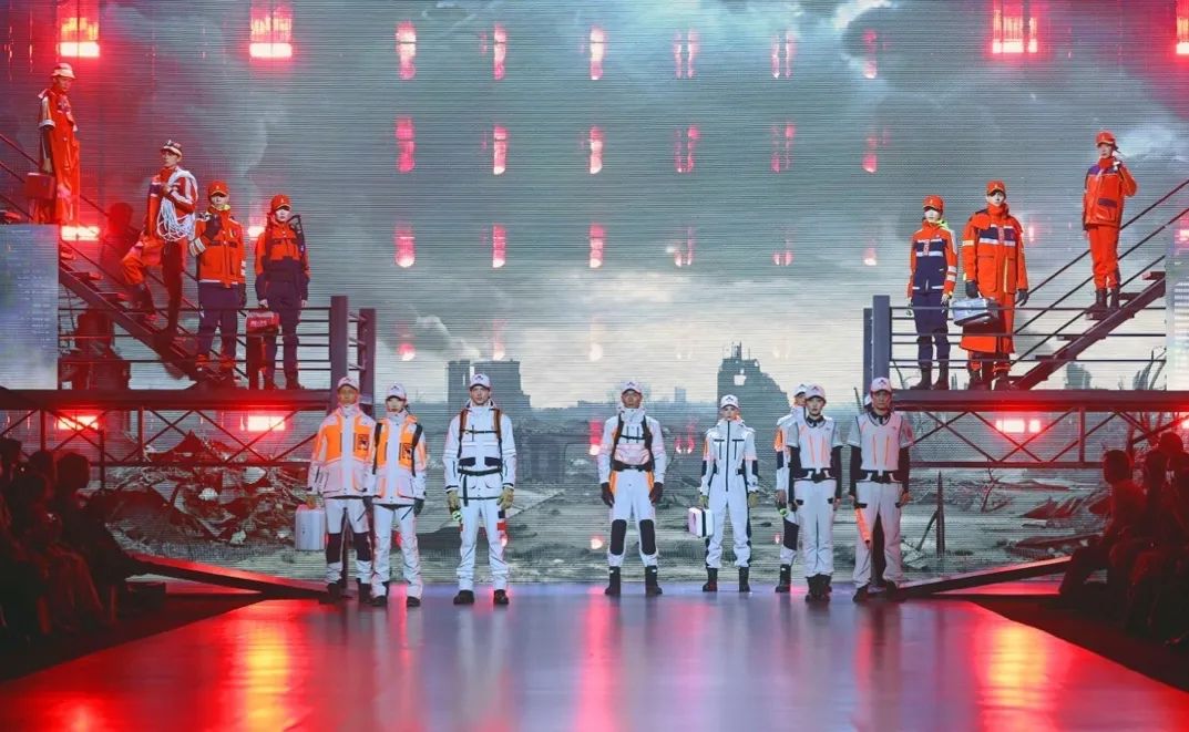 这场激情澎湃、美轮美奂的沉浸式舞台大秀,如同一道烈火般燃烧着现场观众的心灵。发布会由中国职业装领军企业——际华集团与中国职业装设计领军人物刘薇强强联手打造,展示了八大系列、百余套精心设计的“极地户外科技系列、应急抢险救援功能系列、城市保障防护工装系列、国际安保服装装备系列、航空铁路服务系列、金融商务时尚系列”等职业装,煊赫气势全方位多角度展示了身穿际华工装的中国产业大军的现代职业新形象。