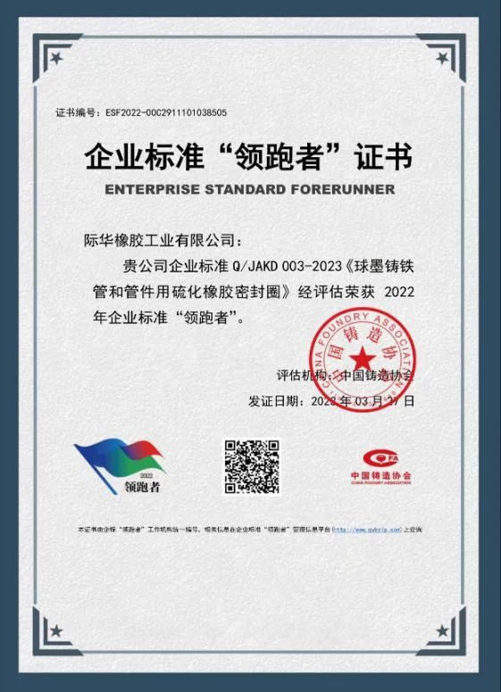 近日,际华橡胶工业有限公司企业标准Q/ JAKD 003 - 2023《球墨铸铁管和管件用硫化橡胶密封圈》再次入选2023年全国企业标准"领跑者"名单。该企业标准中胶圈产品物理性能、尺寸偏差等指标均优于国内相应标准,适配各类球墨铸铁管道配套橡胶密封件。公司目前是国内最大的橡胶密封圈生产企业。