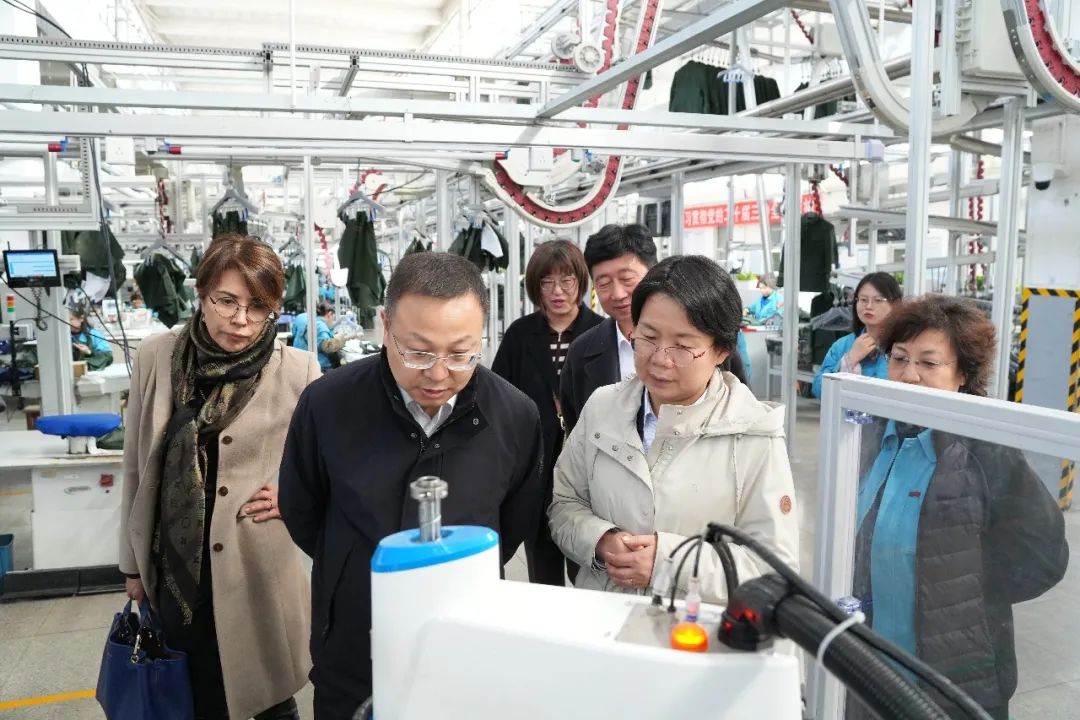 调研组先后参观了一分厂西服类智能生产线、裁片超市、冲锋衣智能生产车间、际华先进陶瓷应用技术实验室以及检测中心,实地了解了公司的生产能力、质量检测能力、智能化建设以及应急救援相关产品。